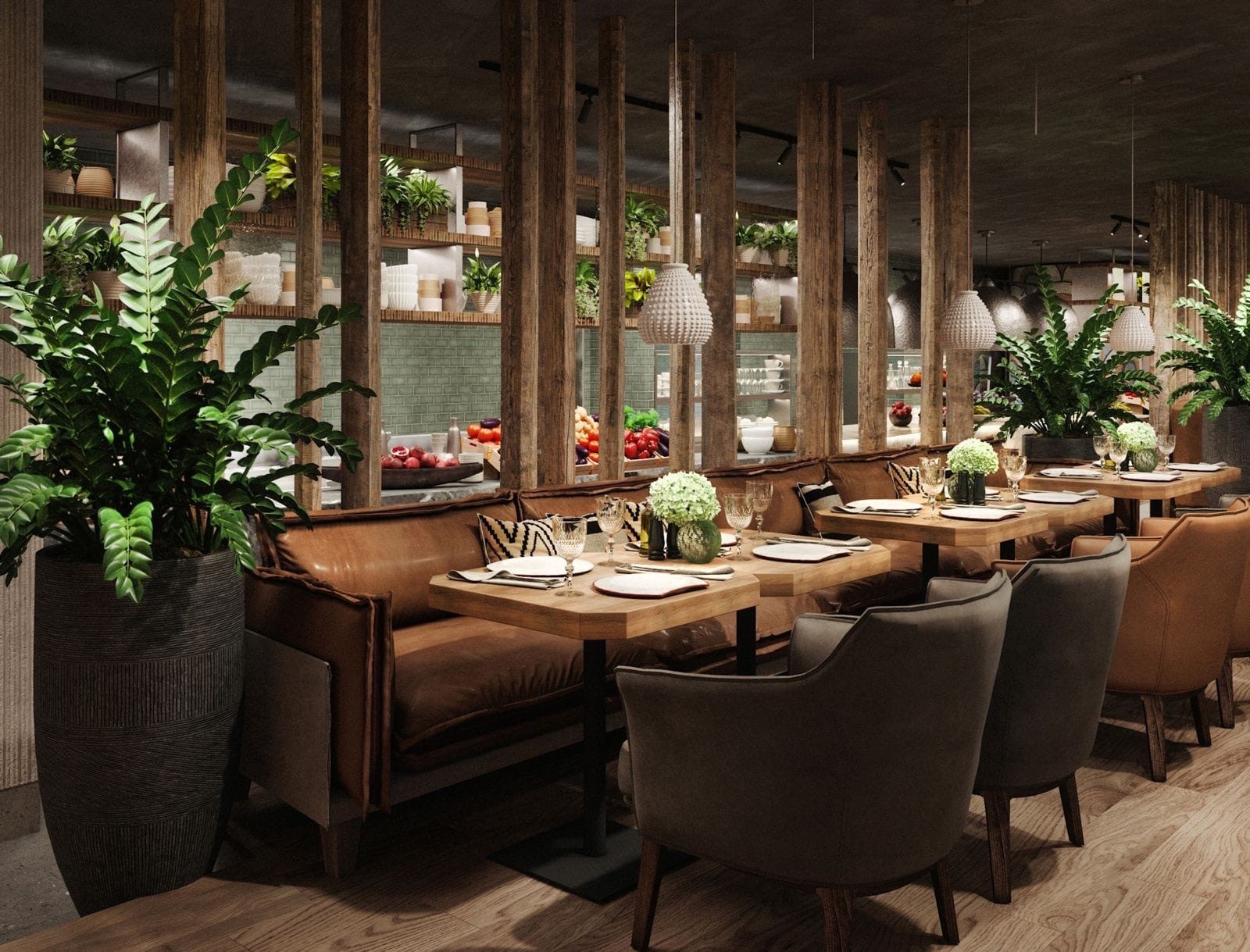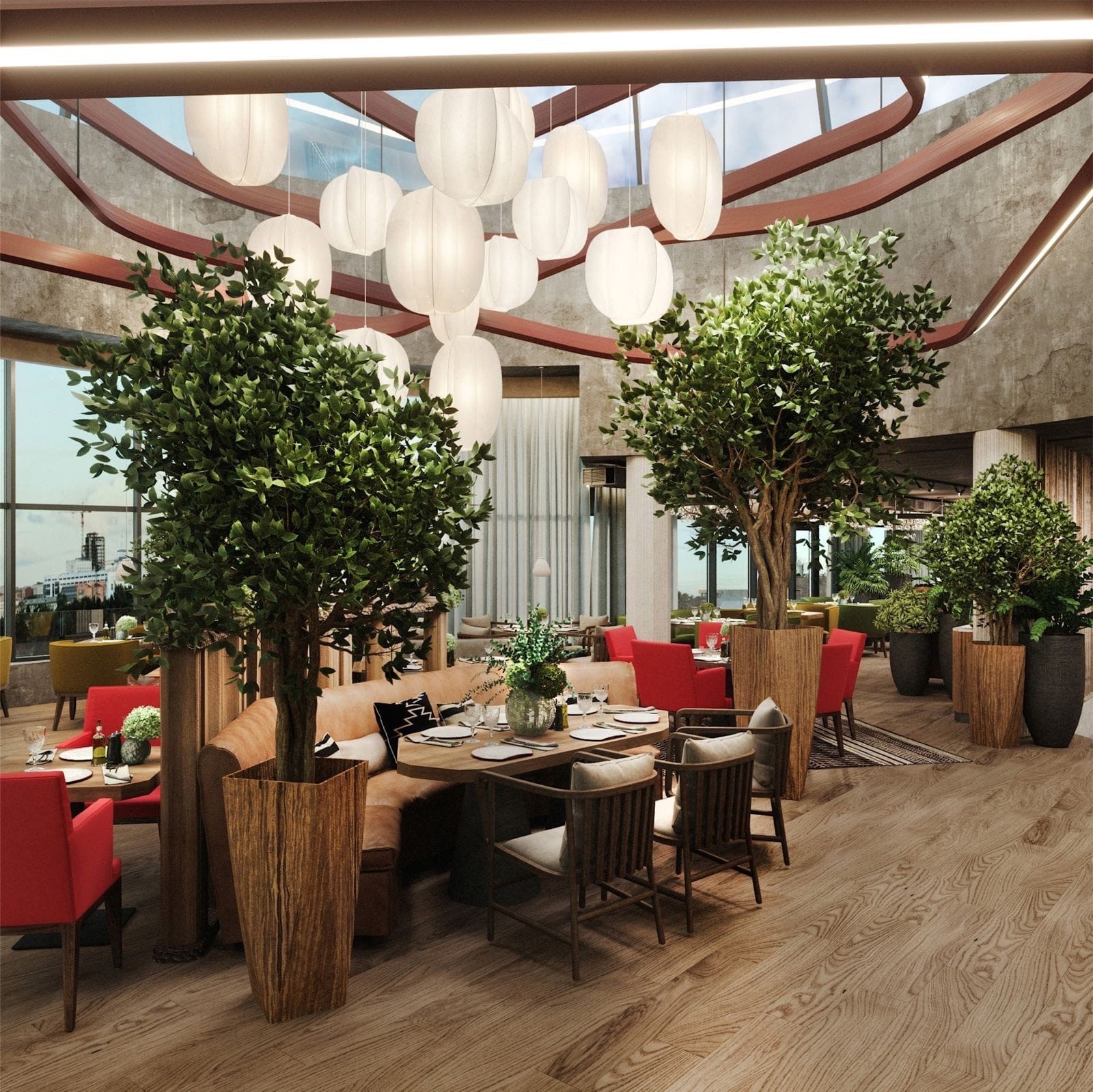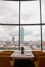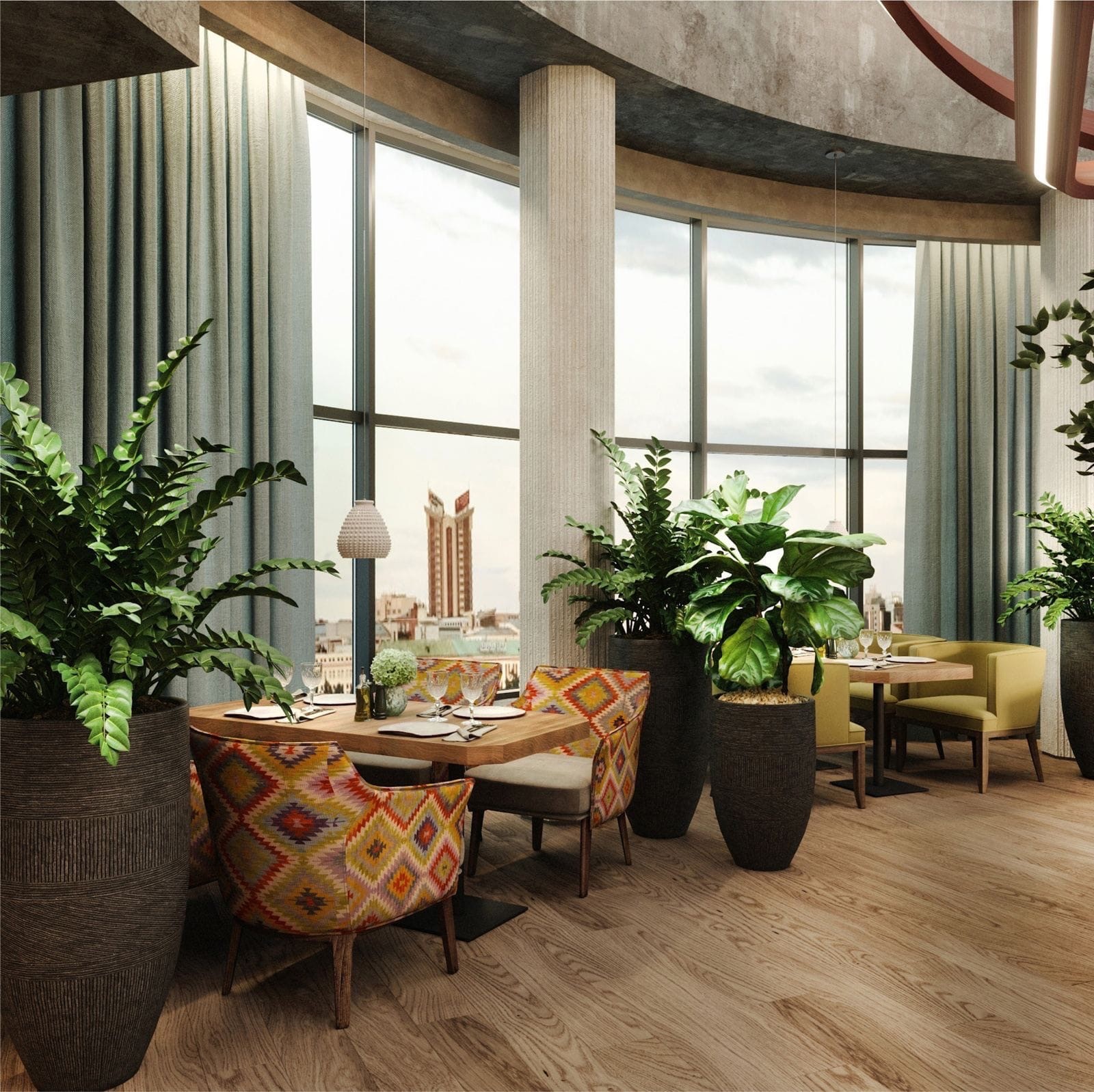 Зал ресторана вмещает до 140 гостей. В интерьере отлично сочетается брутальный индустриальный стиль и яркие горские орнаменты. В помещении панорамное остекление, откуда открывается великолепная панорама на уральский мегаполис. Самым впечатляющим элементом декора является огромный стеклянный купол, благодаря которому днём помещение наполняется естественным светом, а с наступлением темноты позволяет любоваться звездным небом и луной. Купол украшает многоярусная сверкающая люстра, которую создали на Тульском оружейном заводе.